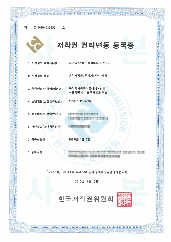 [한국/저작권] 리안의 수학 모험 애니메이션 OST 페이지 정보 작성자 WeDu 댓글 0건 조회 6,493회 작성일 19-11-25 13:54 본문 2019-11-18 저작권 C-2019-033938 음악저작물>주제가>작사·작곡 List Previous[한국/저작권] 리안의 수학 모험 여정의 시작 1,2,3,4,5 21.12.31 Next[한국/저작권] 애니메이션 리안의 수학 모험 19.11.25