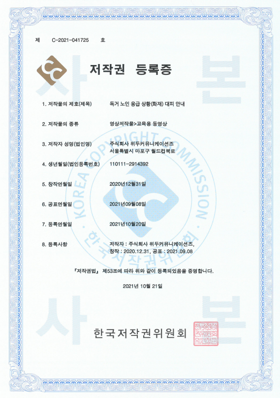 [한국/저작권] 독거 노인 응급 상황(화재) 대피 안내 페이지 정보 작성자 WeDu 댓글 0건 조회 6,362회 작성일 21-12-31 12:41 본문 2021-10-21 저작권 C-2021-041725 영상저작물>교육용 동영상 List Previous[한국/저작권] 장보기 인지훈련 게임 21.12.31 Next[한국/저작권] OLL KIDS/MATH 21.12.31