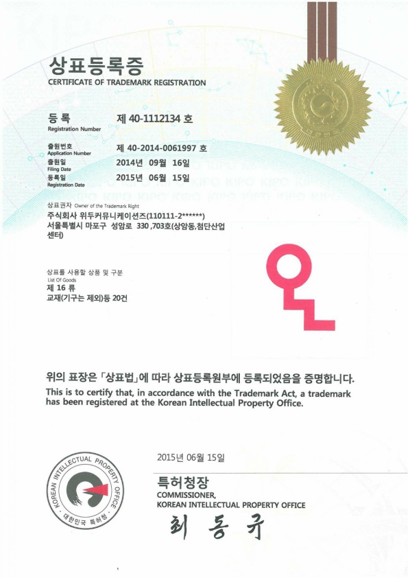 [한국/상표] OLL 16류 페이지 정보 작성자 WeDu 댓글 0건 조회 6,164회 작성일 19-05-30 18:59 본문 2015-06-15 상표 제 40-1112134호 16류 List Previous[한국/상표] OLL 41류 19.05.30 Next[한국/상표] OLL 09류 19.05.30