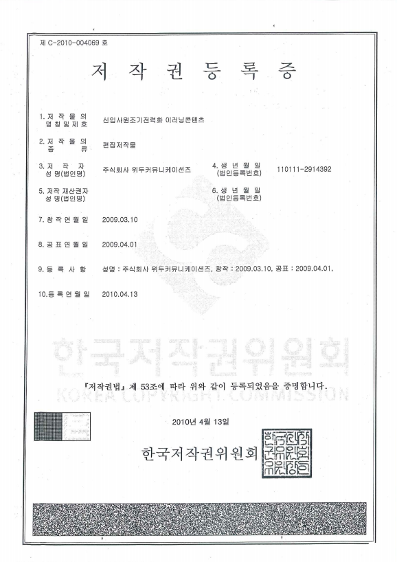 [한국/저작권] 신입사원조기전력화 이러닝 콘텐츠 페이지 정보 작성자 WeDu 댓글 0건 조회 6,049회 작성일 19-05-30 19:01 본문 2010-04-13 저작권 C-2010-004069 신입사원조기전력화 이러닝콘텐츠 / 편집저작물 List Previous[한국/저작권] 리안의 수학 모험 19.05.30 Next[한국/상표] OLL 41류 19.05.30