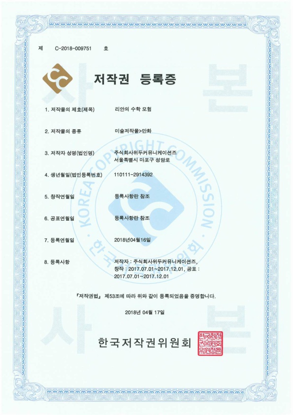 [한국/저작권] 리안의 수학 모험 페이지 정보 작성자 WeDu 댓글 0건 조회 5,971회 작성일 19-05-30 19:07 본문 2018-04-16 저작권 C-2018-009751 리안의 수학 모험 / 미술저작물>만화 List Previous[한국/저작권] 길리 19.05.30 Next[한국/저작권] 신입사원조기전력화 이러닝 콘텐츠 19.05.30